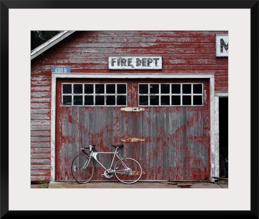 <p>Rustic fire dept. with a bicycle leaning against it in Michigan</p>