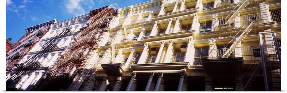 <p>Up-close panoramic photograph of row houses in The Big Apple.</p>