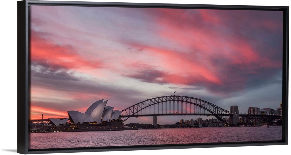 <p>Panoramic photograph of the Harbor Bridge in Sydney, Australia at sunset.</p>