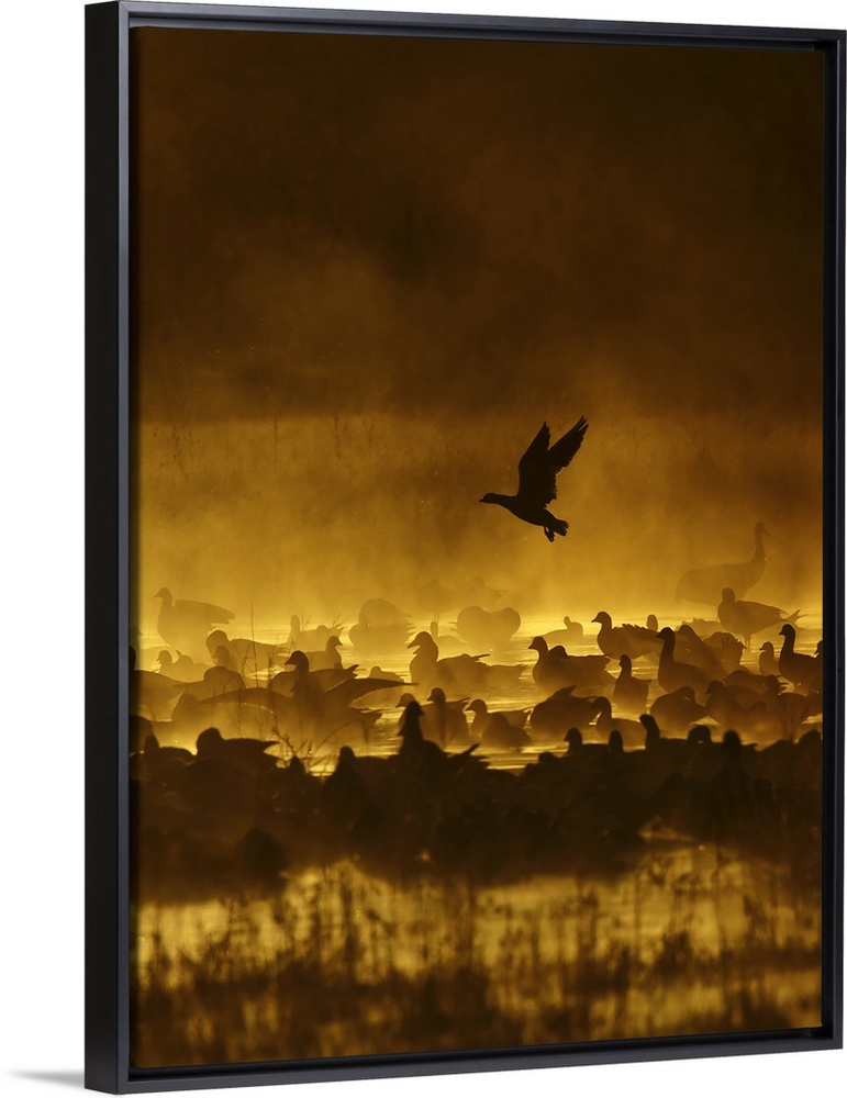 <p>A silhouetted duck flies over its flock on a misty morning, at Bosque del Apache, New Mexico.</p>