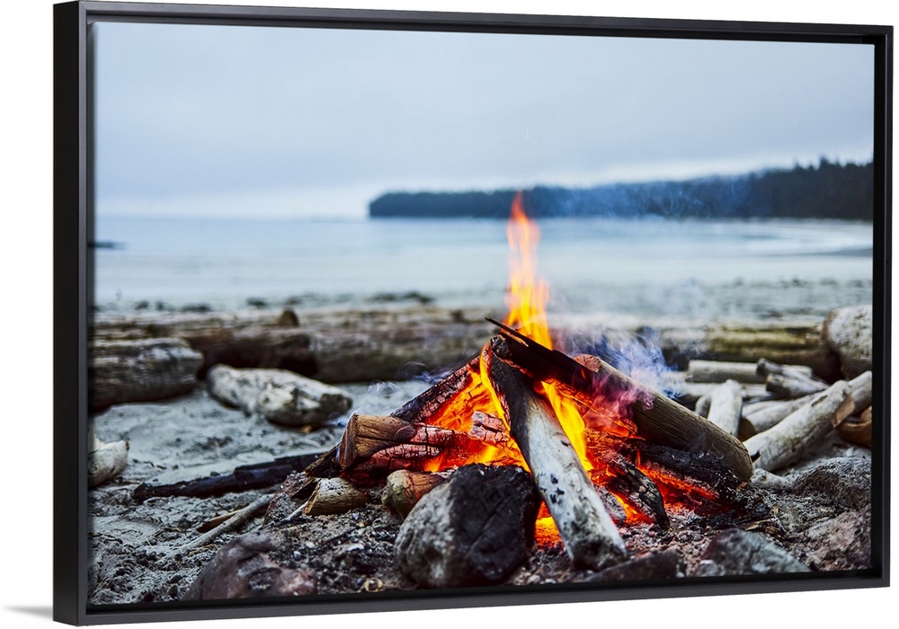 <p>A fire on the beach with the ocean and coastline in the background, Cape Scott Provincial Park; British Columbia, Canada</p>