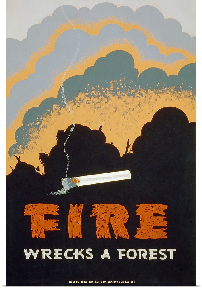 <p>Fire Wrecks A Forest. Poster for forest fire prevention showing a burning cigarette and a forest fire. Library of Congress, Prints and Photographs Division, WPA Poster Collection.</p>