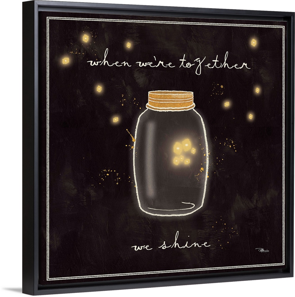 <p>Decorative artwork of a mason jar with a family of fireflies inside and the phrase, "When we're together, we shine."</p>