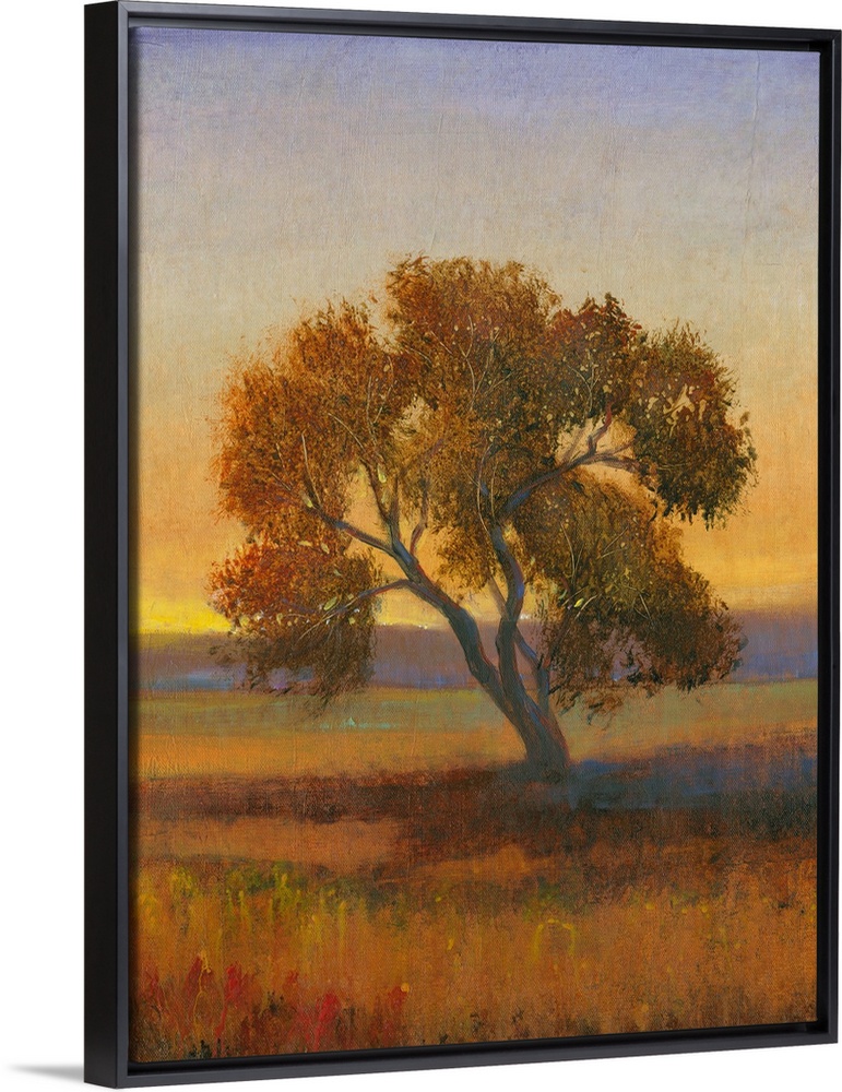<p>Contemporary landscape painting of a lone tree in a meadow at sunset.</p>
