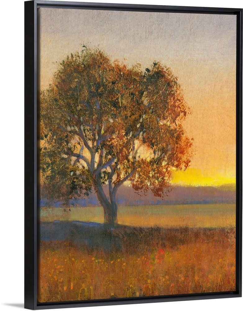 <p>Contemporary landscape painting of a lone tree in a meadow at sunset.</p>
