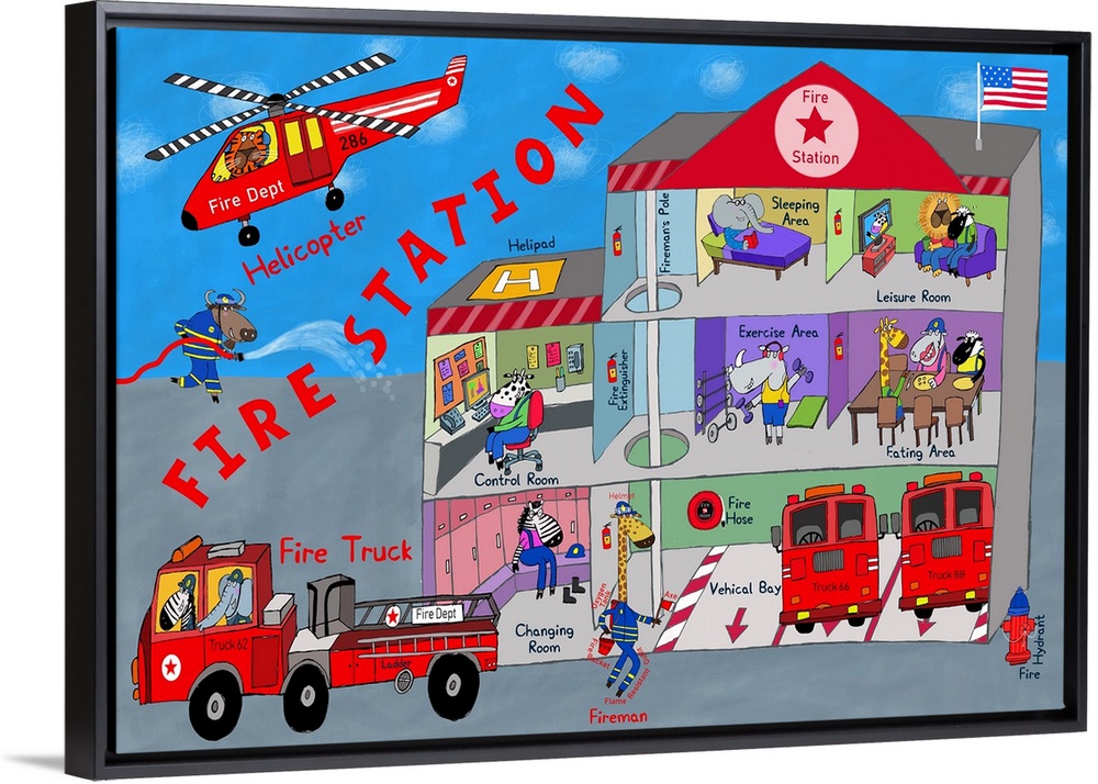 <p>Illustration of fire station and firemen at work. Created by artist Carla Daly.</p>