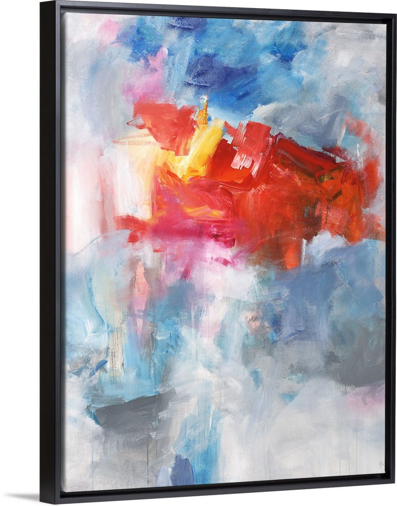 <p>Contemporary abstract painting using bright red tones over a mixture of blue tones over gray.</p>