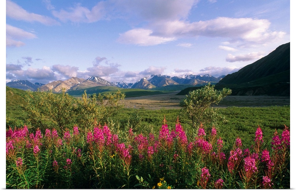 <p>Big landscape photograph of fireweed and green foliage on a rolling landscape, mountains in the distant background, beneath a blue sky, in Denali, Alaska.</p>