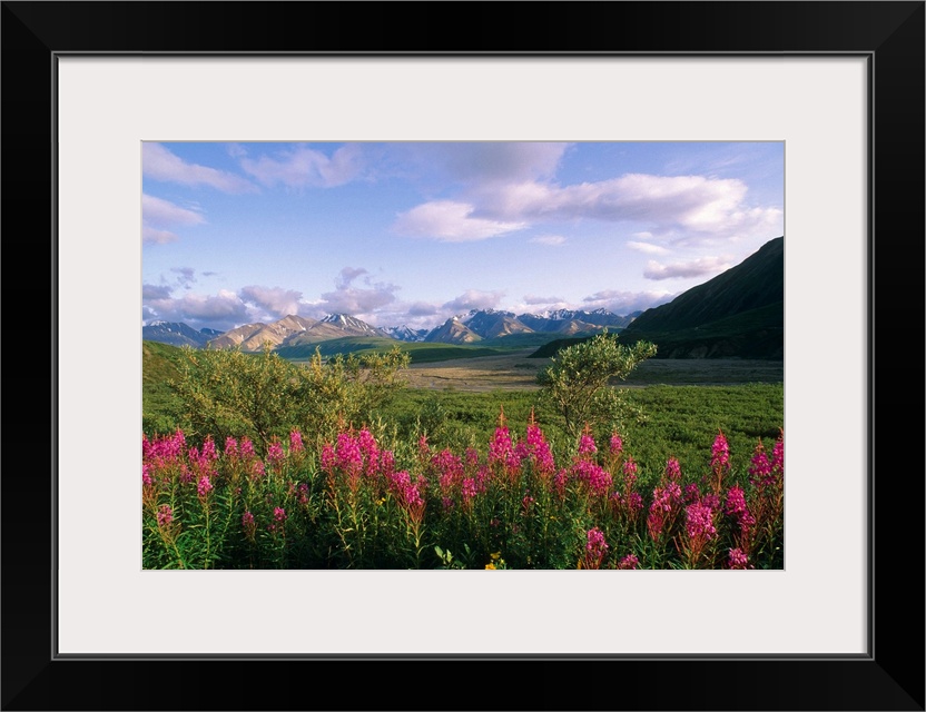 <p>Big landscape photograph of fireweed and green foliage on a rolling landscape, mountains in the distant background, beneath a blue sky, in Denali, Alaska.</p>