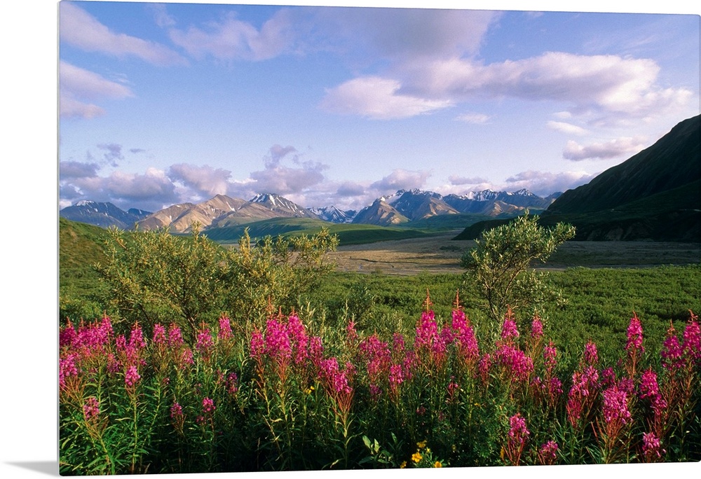 <p>Big landscape photograph of fireweed and green foliage on a rolling landscape, mountains in the distant background, beneath a blue sky, in Denali, Alaska.</p>