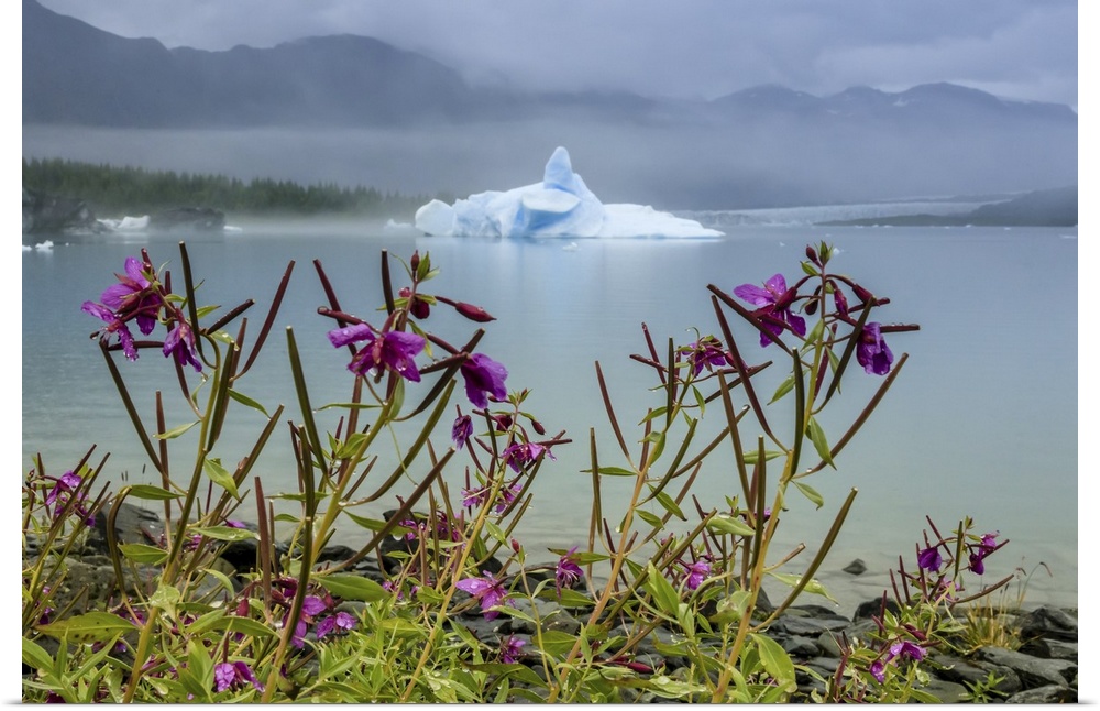 <p>Fireweed (Chamaenerion angustifolium) and sculpted blue iceberg in Bear Glacier Lagoon, Kenai Fjords National Park Alaska, United States of America</p>