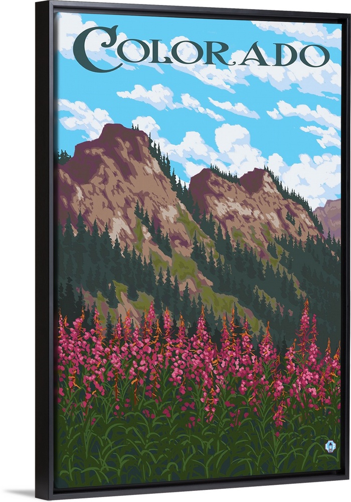 <p>A stylized art poster of a wilderness landscape of wildflowers and mountain peaks covered with pine trees.</p>