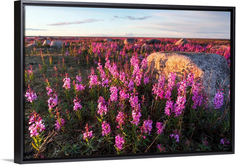 <p>Canada, Manitoba, Fireweed (Chamerion angustifolium) lit by setting midnight sun on sub-arctic tundra along Hudson Bay at Hubbart Point. Photograph by Paul Souders.</p>