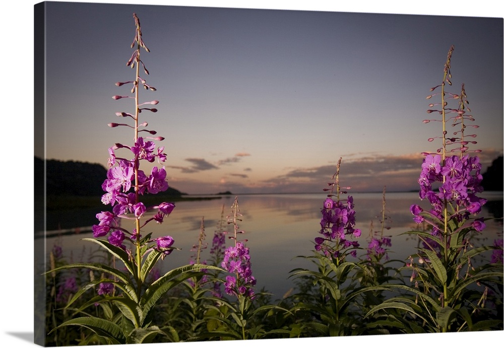 <p>Close Up Of Fireweed With Big River Lakes In The Background At Sunset In Southcentral Alaska During Summer</p>