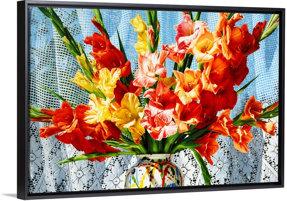 <p>Contemporary vivid realistic still-life painting of bright red orange and yellow flowers in a multi-colored vase, against a background of fabric.</p>