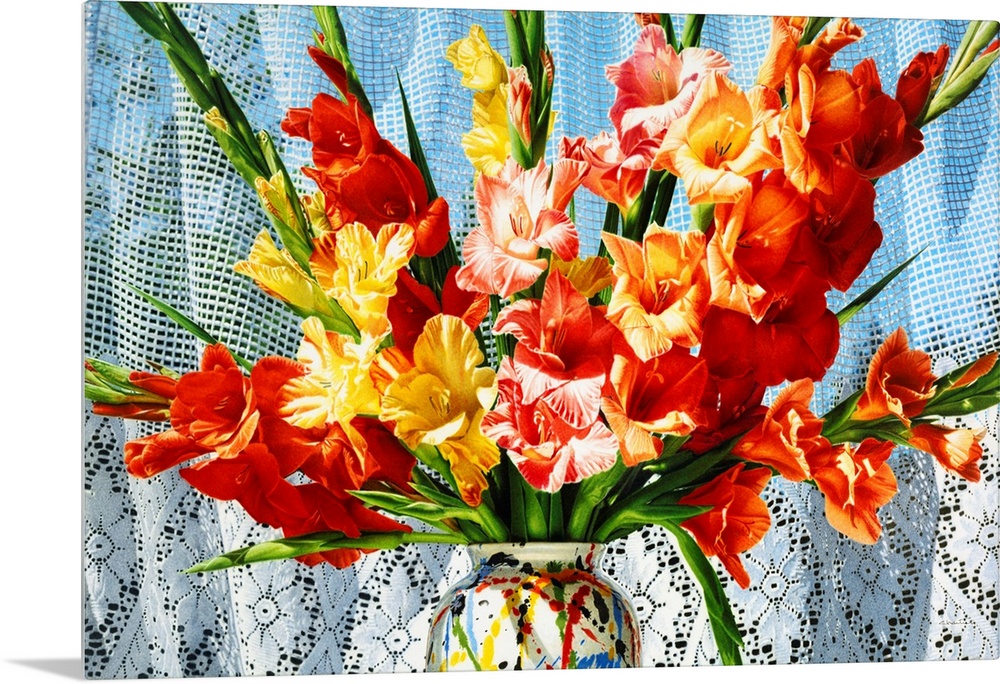 <p>Contemporary vivid realistic still-life painting of bright red orange and yellow flowers in a multi-colored vase, against a background of fabric.</p>