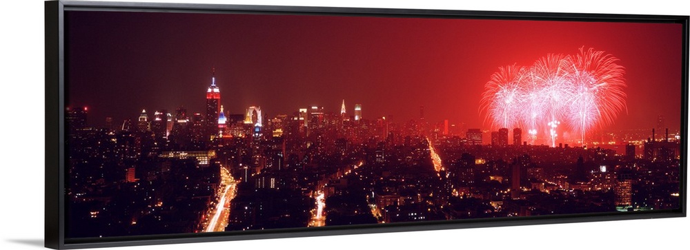 <p>This glowing panoramic wall art captures the burst of three rockets over the water as well as several Manhattan skyscrapers.</p>