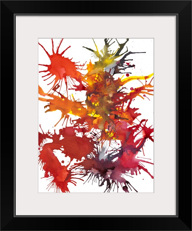 <p>Abstract painting of splattered paint in deep red and orange, resembling fireworks.</p>