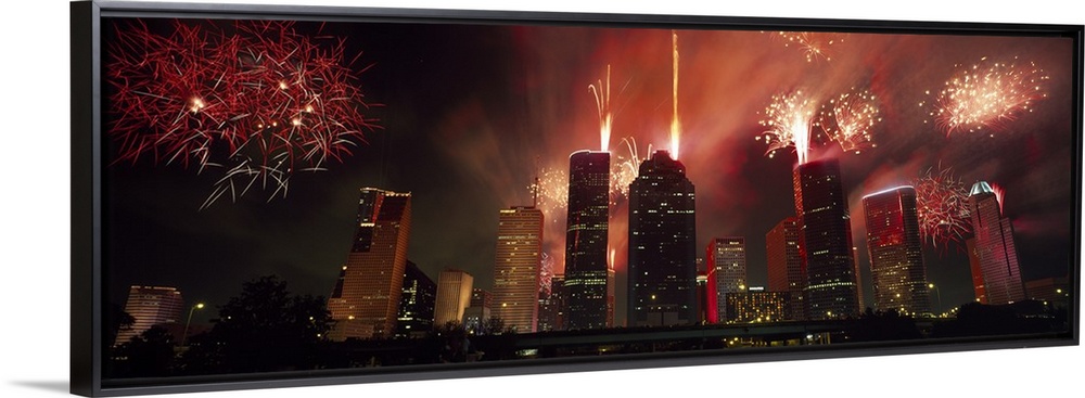 <p>Fireworks explode in the night sky behind the backdrop of the Houston downtown skyline.</p>