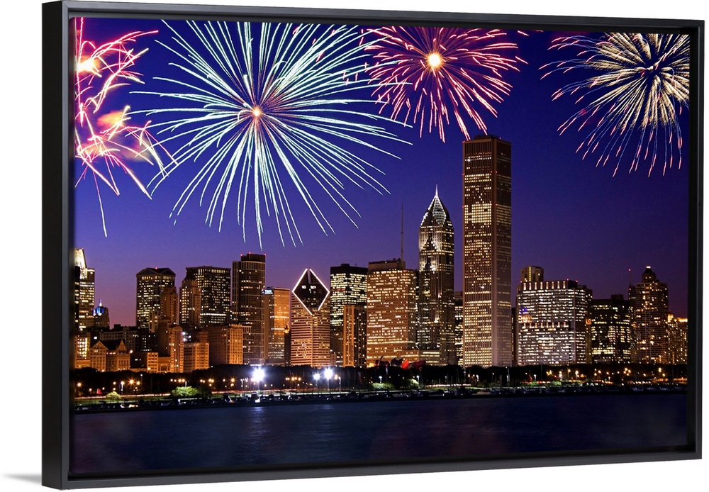 <p>Big photograph at nighttime includes bright pyrotechnics bursting above a row of tall skyscrapers within the largest city of Illinois. The illuminated buildings sit on the edge of a quiet waterway.</p>