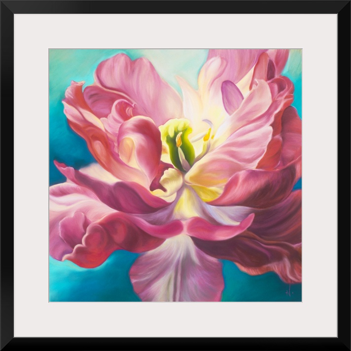 <p>First crush is a big flower painting of a pink tulip on a turquoise background highlighted by sunlight. The tulip painting brings a pop of brightness and joy into a room.</p>