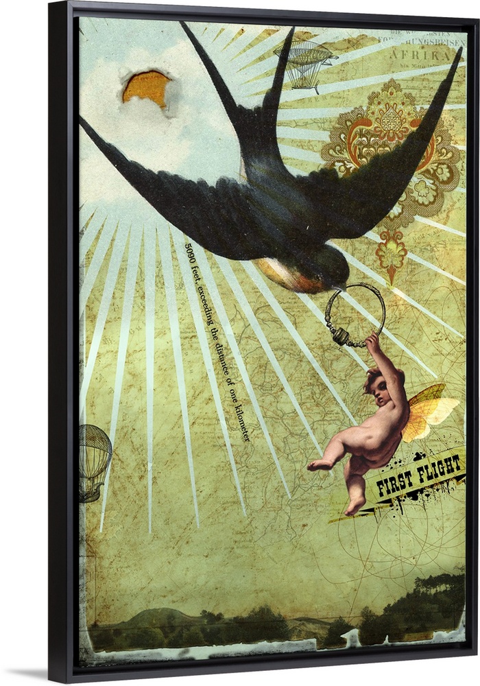 <p>A composite image of a young child with wings holding a ring that is being carried off by a bird.</p>