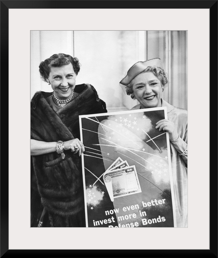 <p>First Lady Mamie Eisenhower and Actress Mary Pickford promote Defense Bonds. April 1, 1953. The investment bonds were issued by the Treasury Department were called 'Defense Bonds' or 'Savings Bonds' during the 1950s, when the National Debt increased from $250 billion in 1950 to $380 billion in 1960.</p>