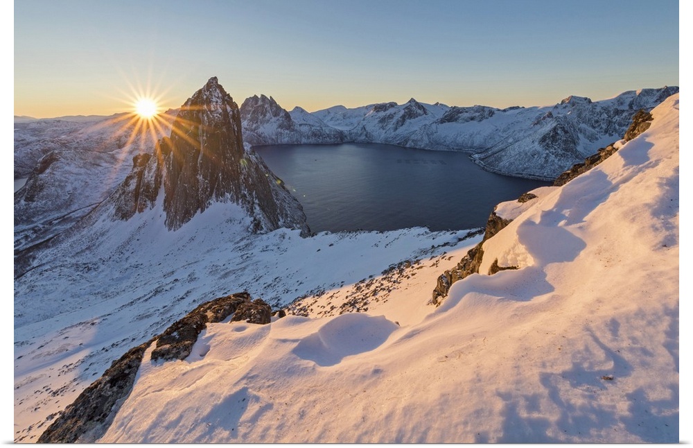 <p>First lights of sunrise on Mount Segla and Mefjorden framed by the frozen sea seen from peak Hesten Senja Tromso Norway Europe</p>