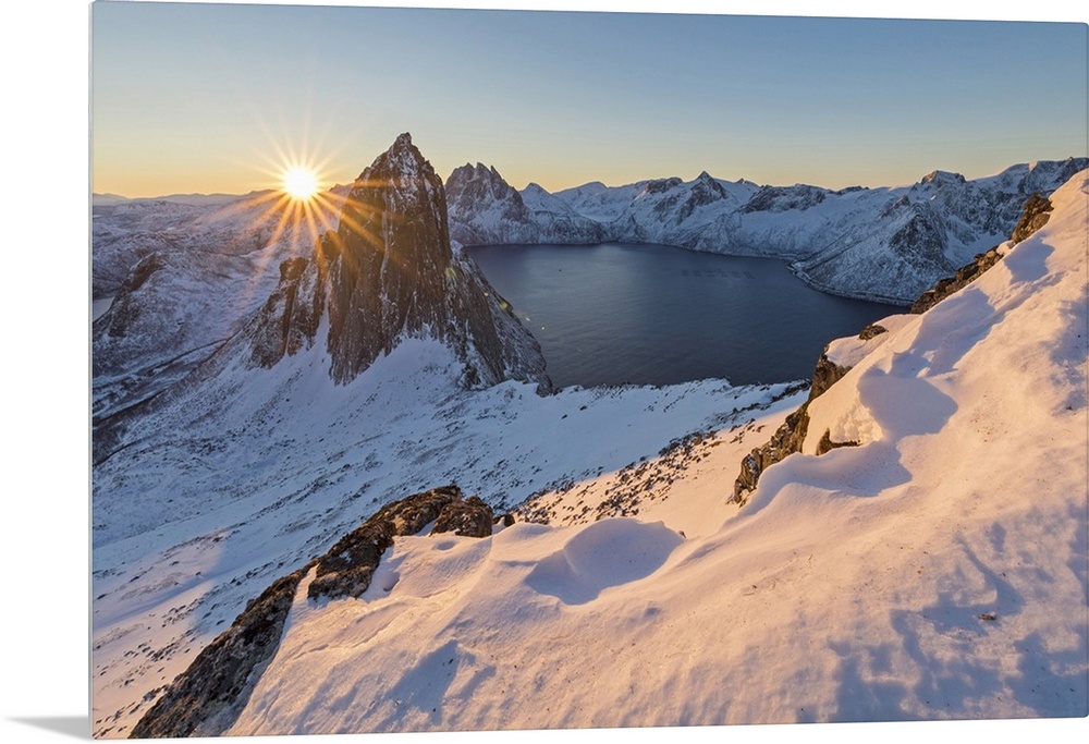 <p>First lights of sunrise on Mount Segla and Mefjorden framed by the frozen sea seen from peak Hesten Senja Tromso Norway Europe</p>