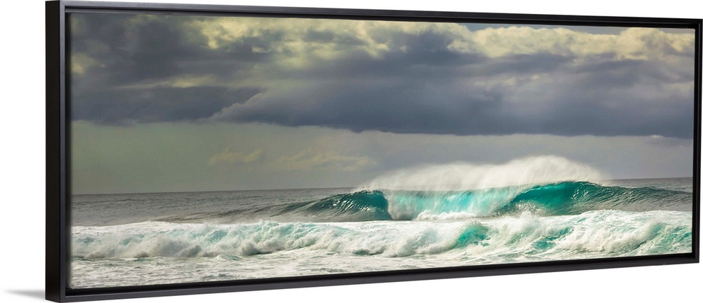 <p>Panoramic image of crashing ocean waves with large clouds above.</p>