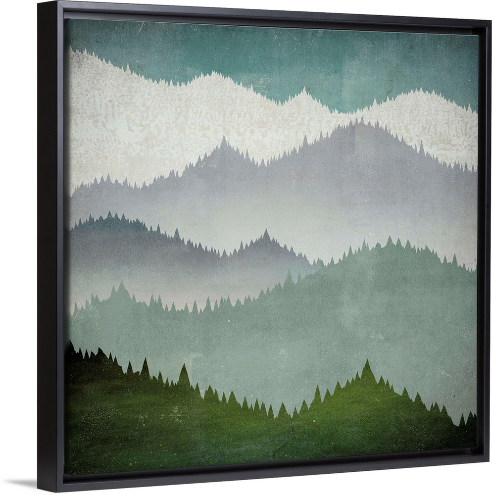 <p>Contemporary artwork of mountains covered in dense forest in cool tones.</p>