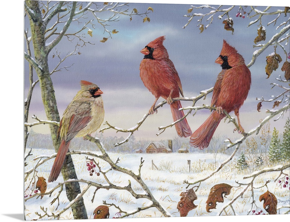 <p>Contemporary artwork of three cardinals perched on thin branches in the winter.</p>