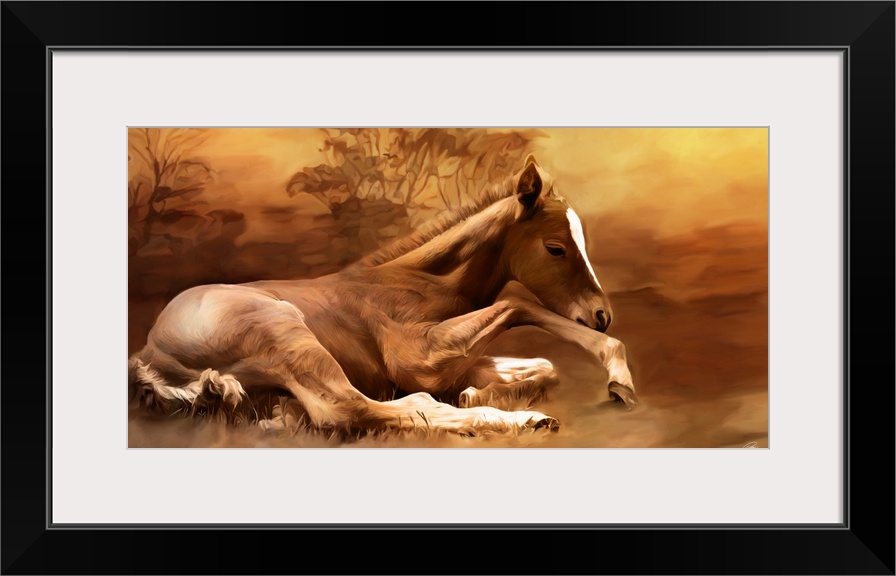 <p>Contemporary animal art of a foal laying peacefully on the ground.</p>