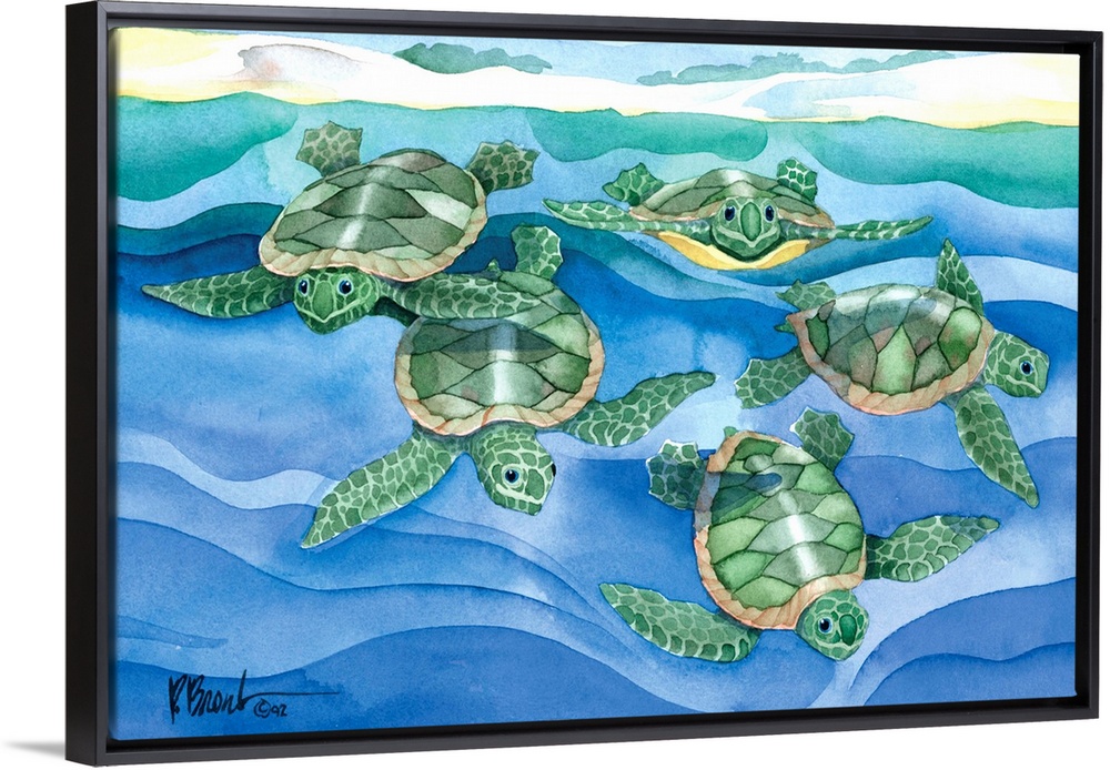 <p>Watercolor painting of a group of sea turtle hatchlings swimming in the ocean.</p>