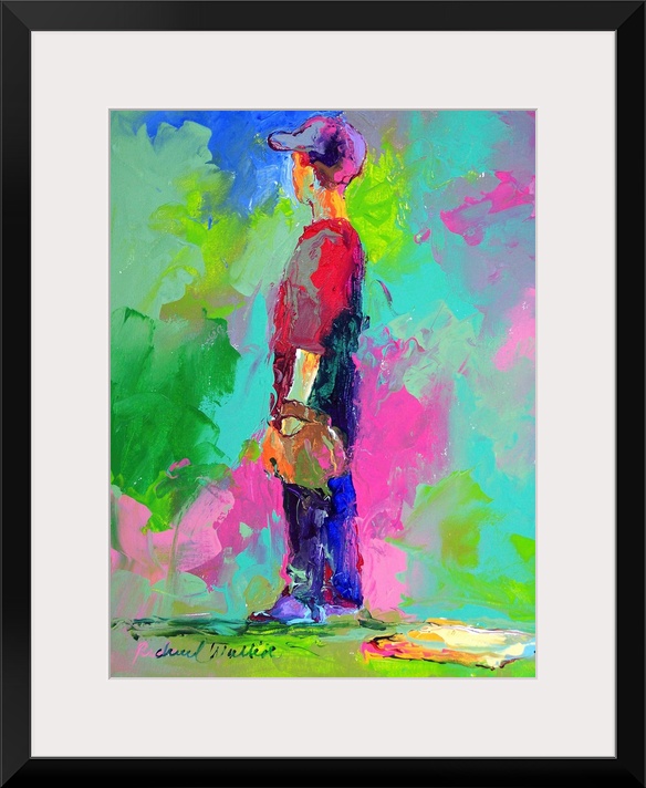 <p>Contemporary vibrant colorful painting of a boy waiting at first base.</p>