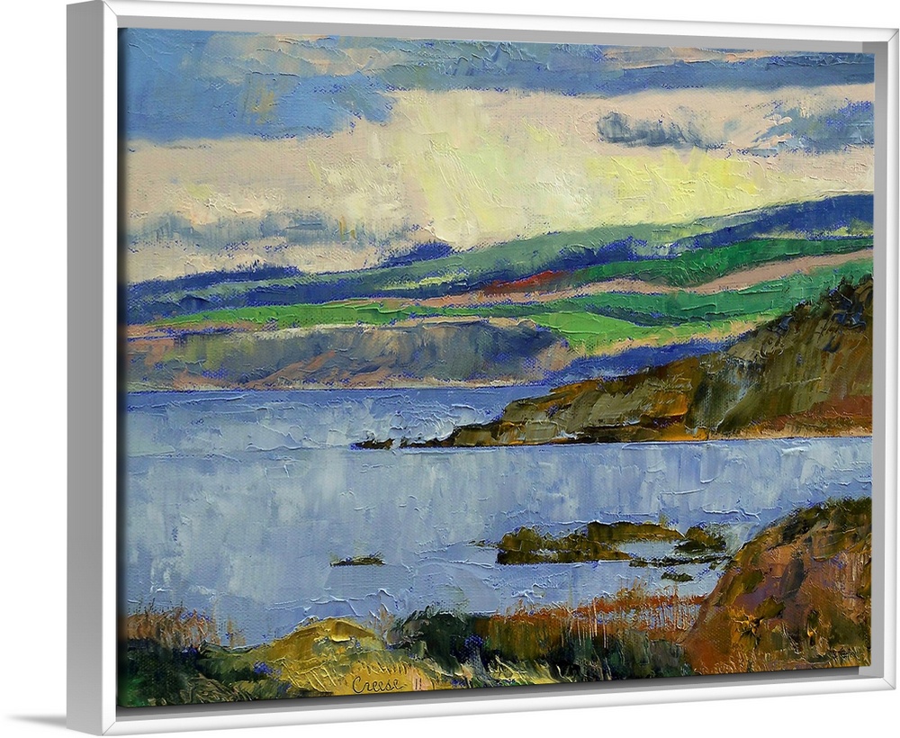 <p>Oil on canvas large wall landscape painting of the Firth of Clyde in the British Isles. Clear water meets cliffs and gentle rolling hills with soothing tones.</p>