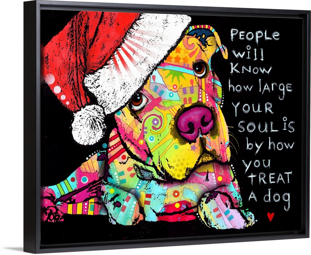 <p>Cute painting of a colorful dog with abstract designs wearing a Christmas hat and the phrase "People Will Know How Large Your Soul is By How You Treat a Dog" written on the side with a red heart.</p>