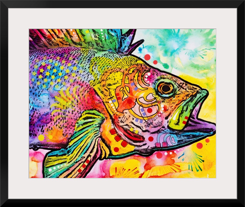 <p>Vibrant painting of a fish with abstract designs and its mouth wide open.</p>