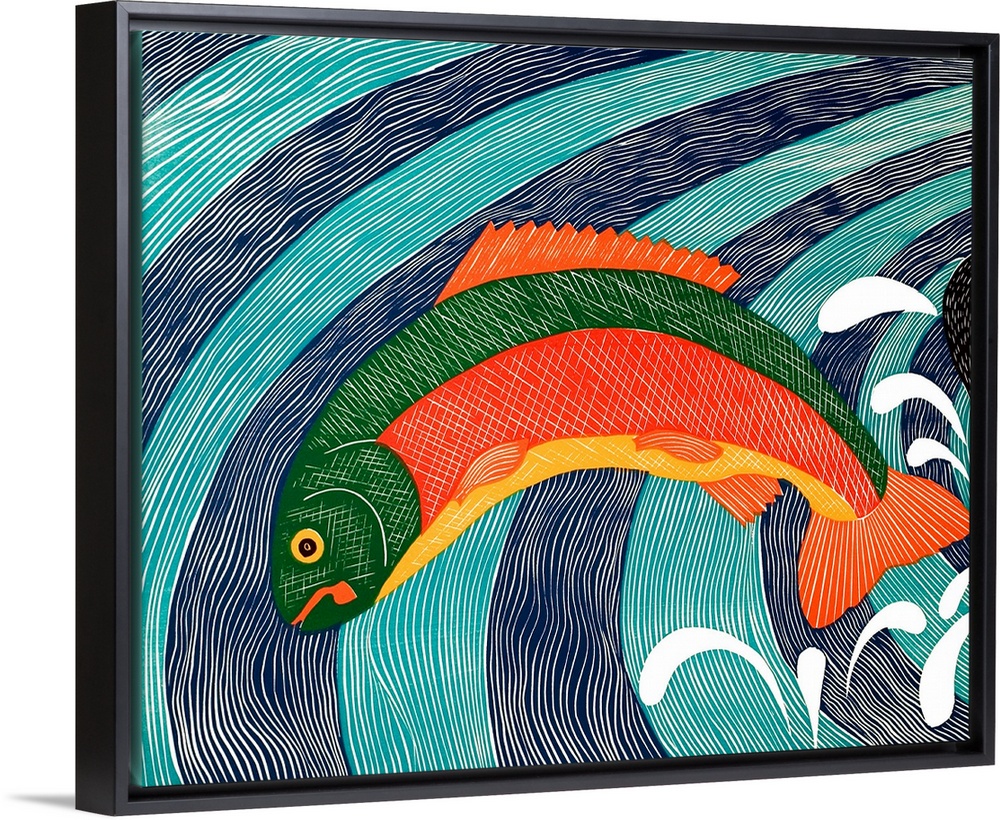 <p>Illustration of a colorful trout jumping out of the water.</p>