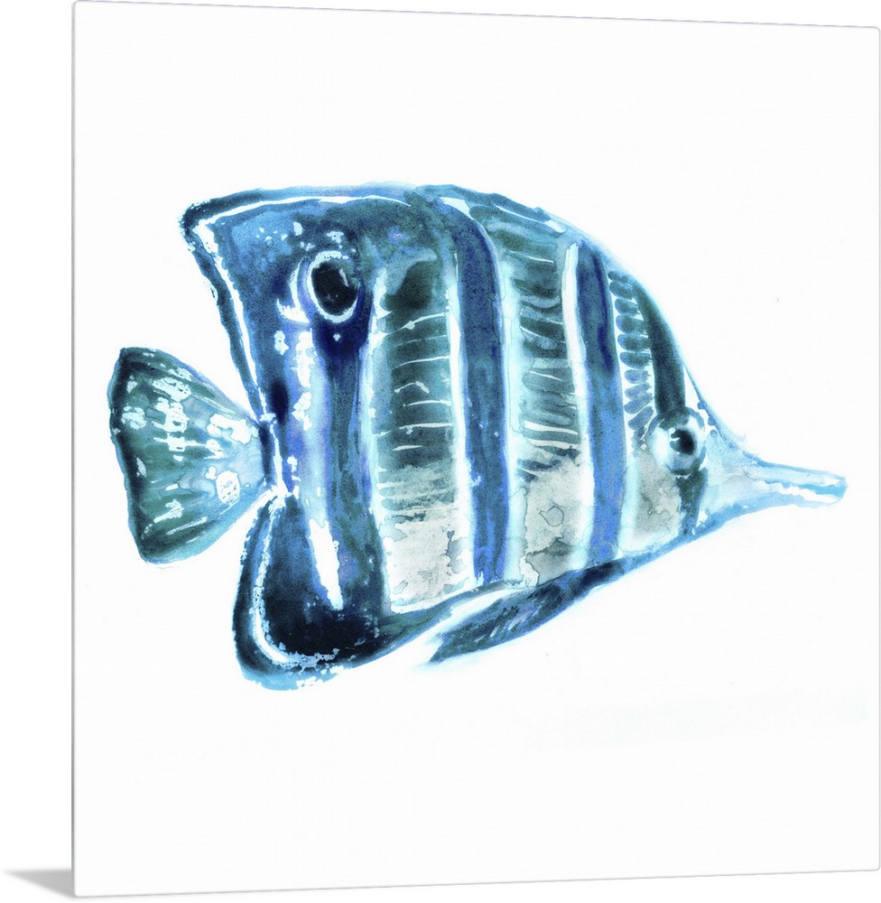 <p>Blue-toned watercolor painting of a tropical fish on white.</p>