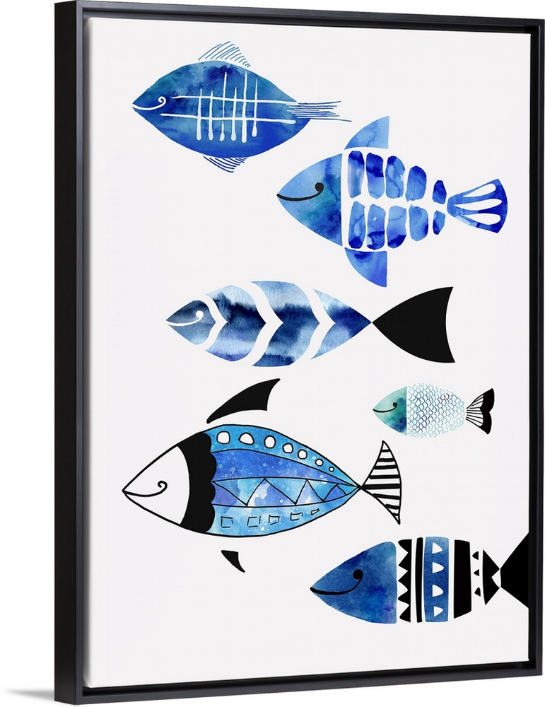 <p>A modern watercolor design of a group of fish in different patterned colors of blue and green.</p>
