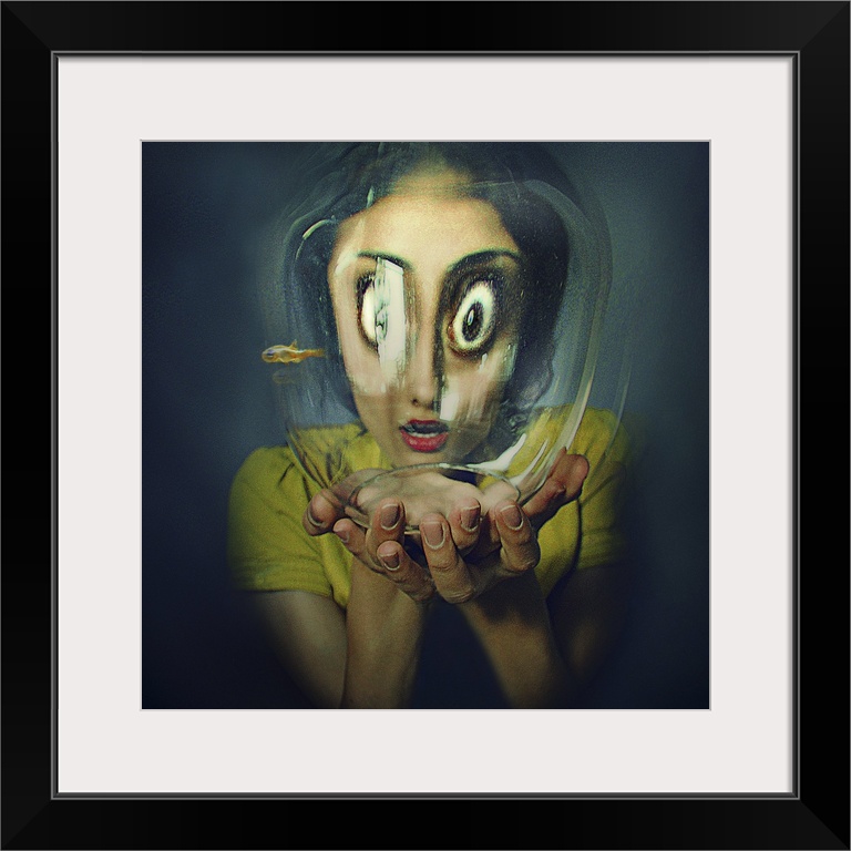 <p>Humorous image of a woman looking into a fishbowl, the glass distorting the appearance of her face.</p>