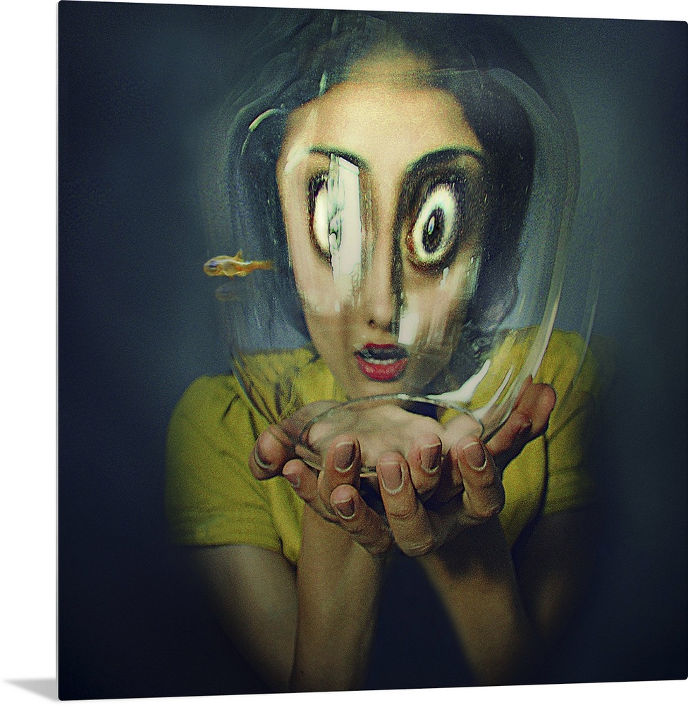 <p>Humorous image of a woman looking into a fishbowl, the glass distorting the appearance of her face.</p>