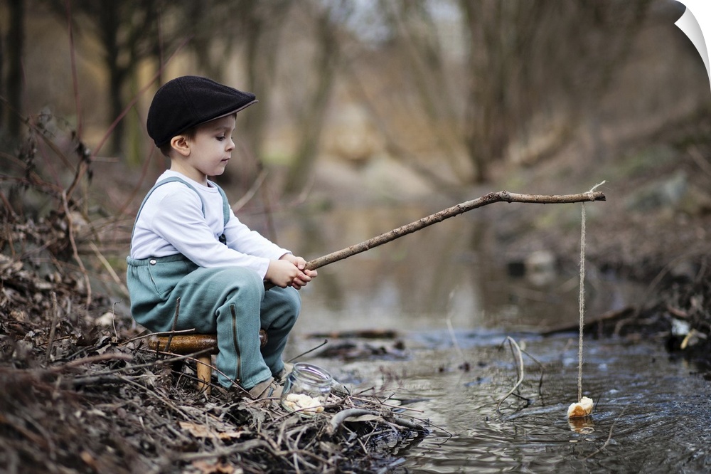 <p>Portrait of a young boy at the edge of a stream with a simple fishing rod.</p>