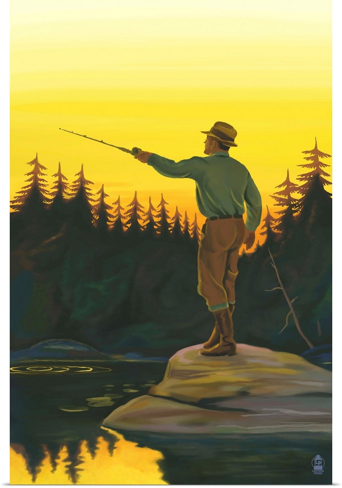 <p>Retro stylized art poster of a fisherman casting his line.</p>