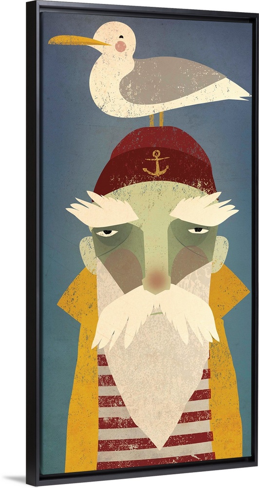 <p>Artwork of a sailor with a white beard and a seagull on his head.</p>