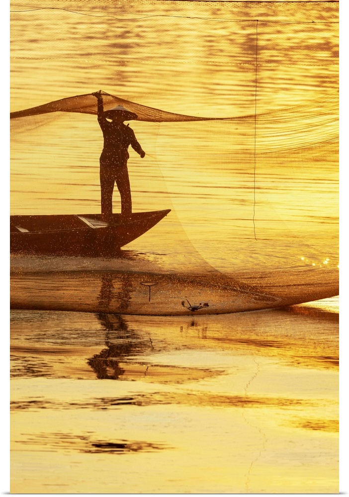 <p>Fisherman working on the nets at sunrise, Thu Bon River, Quang Nam Province, Vietnam.</p>