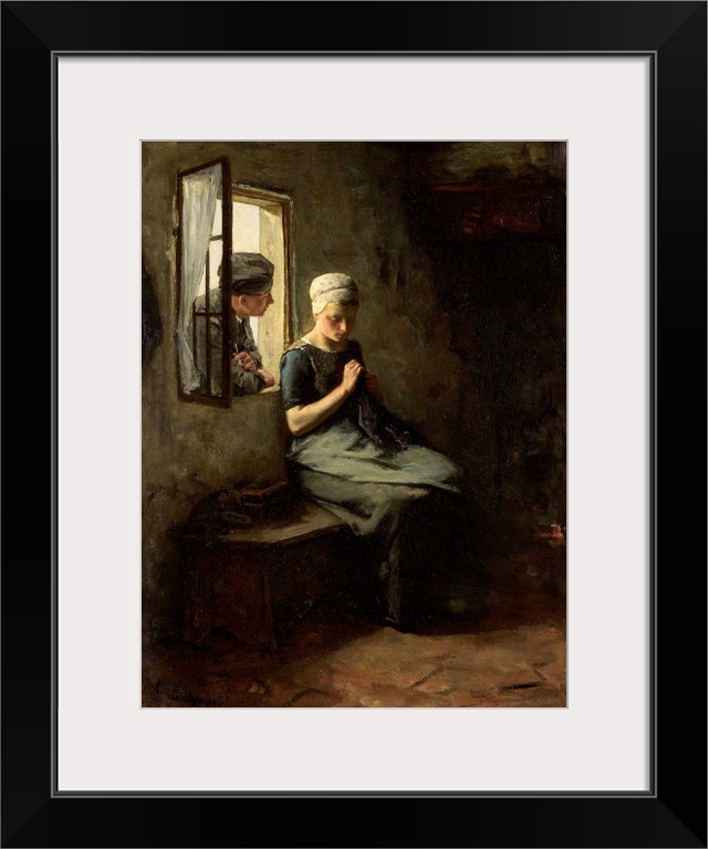 <p>Fisherman's Courtship, by Albert Neuhuys, 1880. Dutch painting, oil on canvas. A young man leaning in a window to talk to girl sitting on a bench sewing.</p>