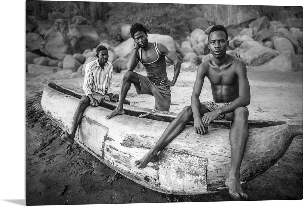 <p>Three fishermen from Malawi posing with their canoe on the beach.</p>