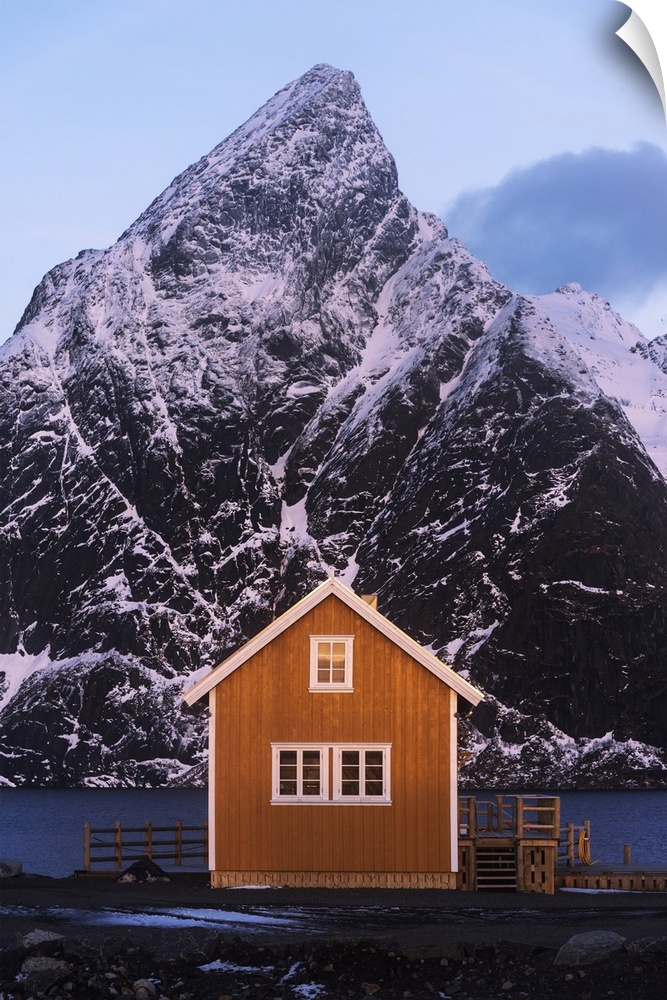 <p>Fishermen's cabin (rorbu) of Sakrisoy along the coast at sunrise in the Lofoten islands, Norway</p>